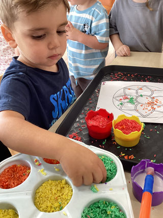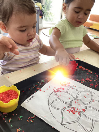 At Happy Days West Hoxton, the children embraced the spirit of Diwali through creative and sensory experiences. In the Big Explorers room, they engaged in a Rangoli torn paper craft, where they created beautiful patterns using torn coloured paper, and explored a large Rangoli drawn in a tuff tray, decorating it with loose parts to bring colour and life to their design. Meanwhile, in the Little Learners room, the children used vibrant coloured rice to decorate Rangoli templates, building their fine motor skills while learning about the artistic traditions of Diwali. These meaningful activities not only encouraged creativity and exploration but also helped the children connect to the cultural significance of Diwali in an engaging and age-appropriate way.