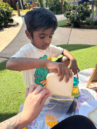 During morning minutes, the Big Explorers have been developing their social skills through our new rainbow roll call routine. Each child is encouraged to find their photo and name on the whiteboard and place it onto the rainbow, supporting their recognition skills while also fostering a sense of belonging to the group. To extend this experience, educators have introduced a good morning song, “Bee Bee Bumble Bee, can you say your name for me... my name is...” which gives each child the opportunity to share their name with the group. This promotes confidence, turn-taking, and respectful listening, while also helping the children to learn and remember each other’s names, strengthening their social connections.